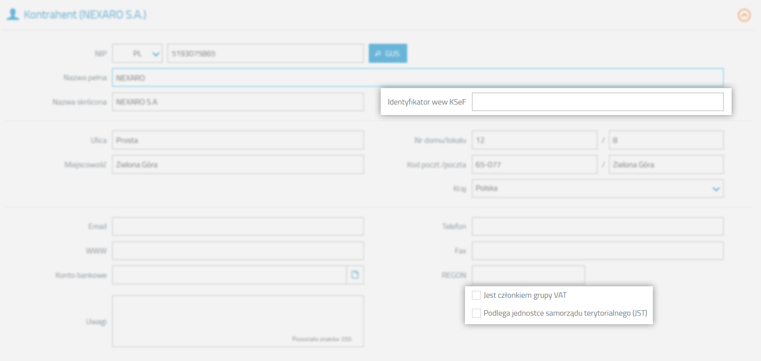- Dane z tych pól są wykorzystywane podczas generowania faktur ustrukturyzowanych wysyłanych do KSeF.