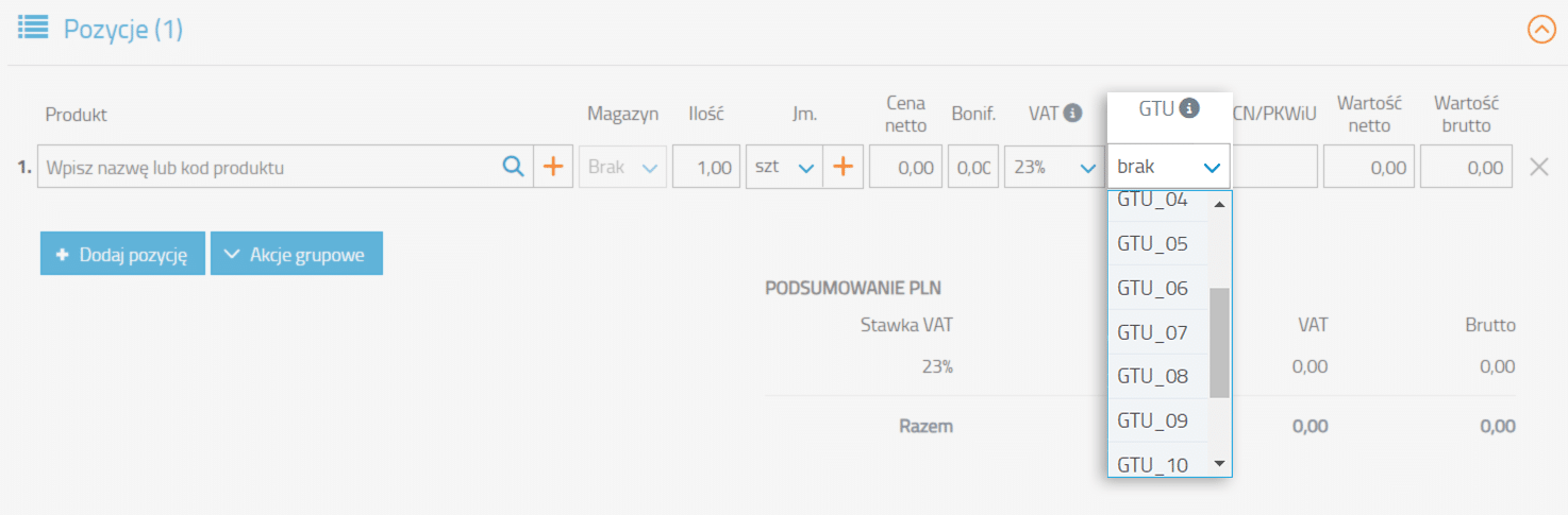 GTU możesz określić zarówno na poziomie kartoteki towarowej (Magazyn -> Produkty -> wybierając produkt).